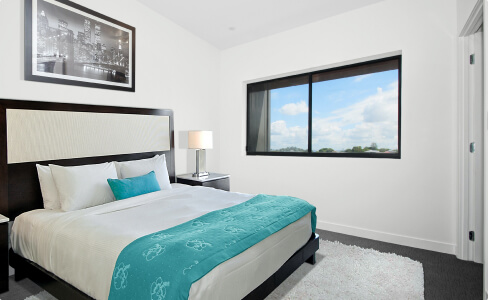 Luxe with private balcony for 2-4 persons, 54 m², oversized bathroom with deep soaker tub, separate walk-in shower and double sink vanity, separate toilet, spacious walk-in closet, bedroom and divided living area with comfortable sleeper sofa bed